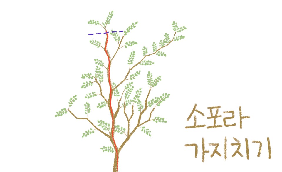 수형을 위해 가지치기를 할 때는 소포라의 중심 줄기를 파악하는 것이 중요합니다. 위의 그림에서 빨간색으로 표시한 줄기가 중심 줄기입니다. 중심 줄기로부터 곁가지가 나오는 것을 확인할 수 있습니다. 중심 줄기는 하나 이상일 수도 있습니다. 원하는 소포라의 모양에 따라 삐쳐나온 줄기를 잘라내면 예쁜 수형을 기대할 수 있답니다.