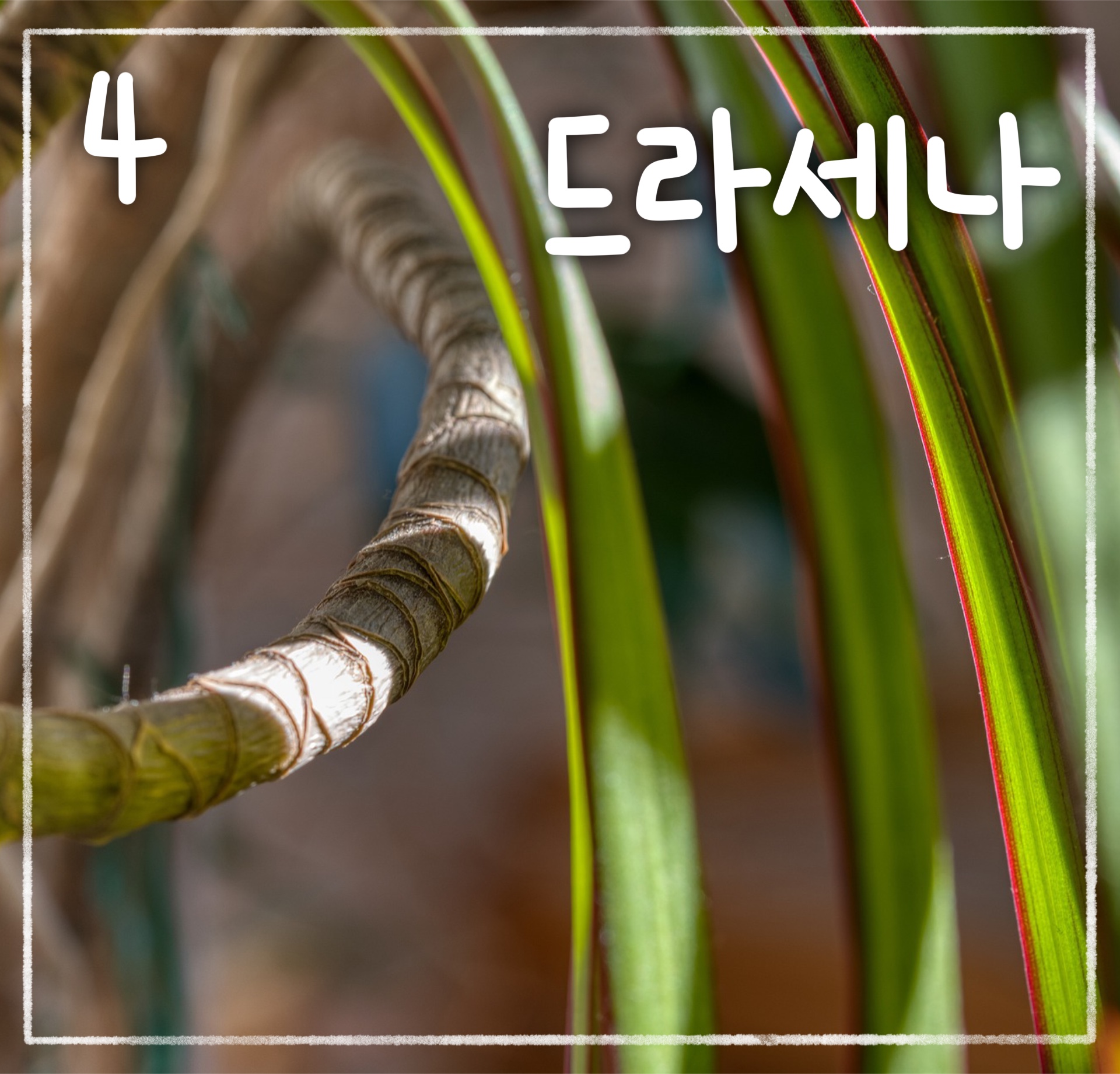 줄기를 보면 마치 대나무처럼 마디가 있는 드라세나는 개운죽의 형제뻘입니다. 매우 다양한 종이 있으며, 종에 따라 잎에 하얀 줄무늬가 있는 것도 있습니다. 흔히 행운목으로 알려져 있는 나무도 드라세나의 한 종입니다. 드라세나는 열대우림에서 전해져 왔다고 합니다. 본토에서는 매우 굵고 크게 자라지만 한국에서는 얇고 키가 작은 경향이 있다고 하네요. 또한 드라세나는 집안의 독소를 잘 걸러내는 최고의 공기 정화 식물이지만, 독성이 있어서 반려동물이 절대 먹지 못하도록 해야 합니다.