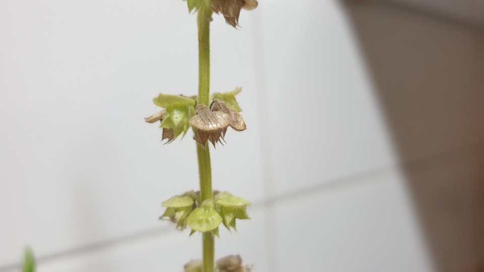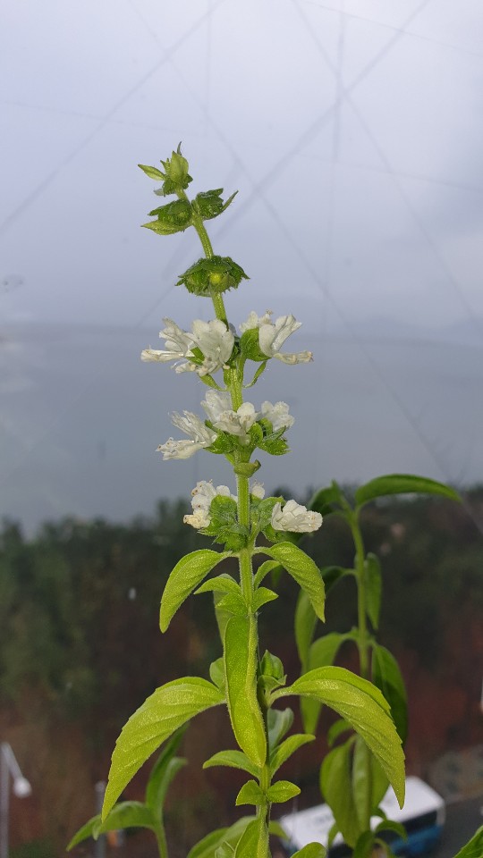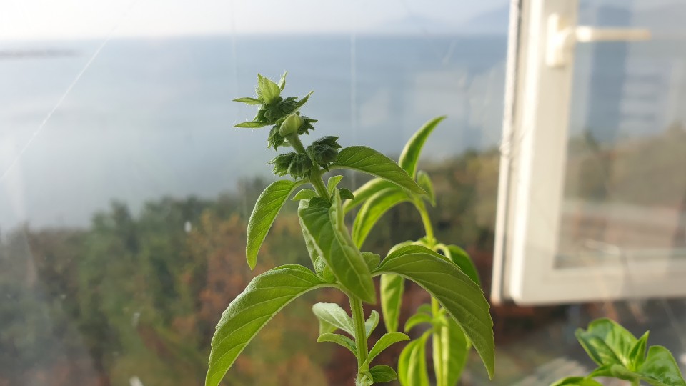 파종한 지 두어 달쯤 되었을 때, 바질 꽃망울이 맺히기 시작했습니다. 꽃이 피면 잎이 거칠어지기 때문에, 잎을 이용할 경우에는 꽃대를 잘라 줍니다. 꽃은 감상하거나 식용으로 사용할 수도 있으므로 자르지 않고 남겨두는 것도 좋습니다.