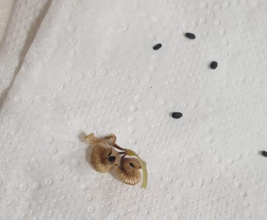 마른 꽃받침을 동째로 따서 뒤집어보면 씨앗이 2~3개 들어 있습니다. 꽃받침을 조심스레 까서 씨앗을 꺼냅니다. 하얀 티슈나 종이에 올려놓고 채종하면 씨앗을 쉽게 구분할 수 있습니다.