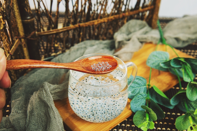 바질 씨앗은 검은 참깨처럼 생겼습니다. 바질 씨앗을 이용하는 재미있는 사례도 있는데요. 씨앗을 물에 불리면 투명하고 말랑한 막이 씨앗 주변에 생기는데, 그것을 음료수로 마실 수도 있습니다.