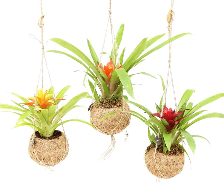 또한, 브로멜리아드는 특이한 구조를 가진 착생식물입니다. 뿌리가 아주 작은데다가 뿌리의 기능을 잎 사이 공간이 대신할 수 있습니다. 잎들이 자라나는 곳에 작은 컵과 같은 공간이 있는데, 그곳에 뿌리 대신 물을 넣으면 물이 공급됩니다. 그래서 브로멜리아드는 화분에 키우지 않고 에어플랜트로 꾸밀 수 있습니다. 작은 컵이나 바크로 뿌리를 감싼 뒤에 매달거나 마크라메와 함께 걸면 멋진 분위기를 연출할 수 있습니다.